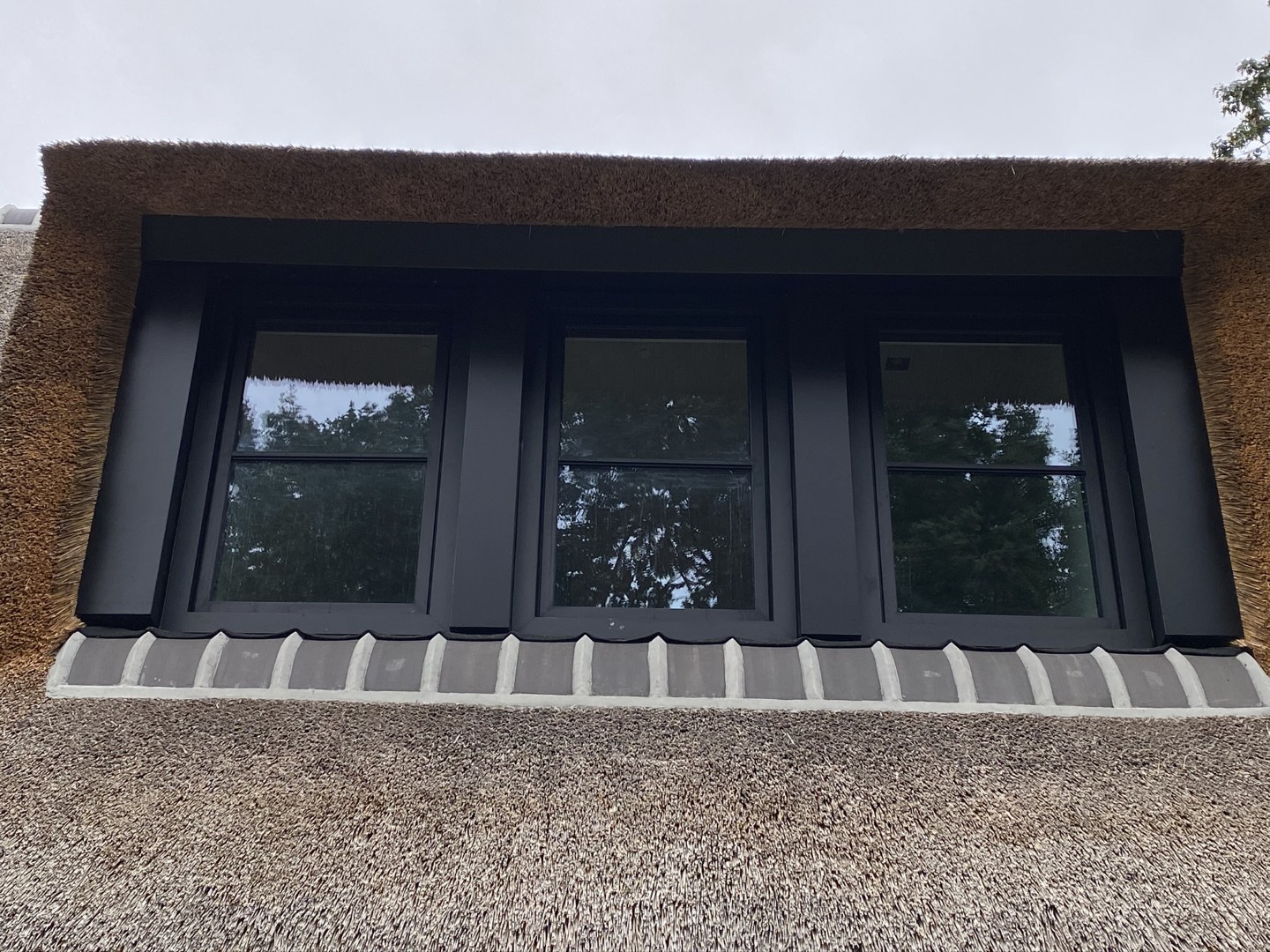 Voor dit project is gekozen voor Aliplast aluminium profielen, uitgevoerd in de kleur RAL 9005 – Zwart structuurlak. Deze diepzwarte tint benadrukt de contrasten in de gevel en vormt een elegant samenspel met het natuurlijke riet en de lichte gevelstenen.